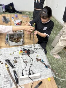 子どもたちの発想で自分のお気に入りの置物や剣を作って楽しんでいました。高齢者の方も器用に飾りを作っておられました。